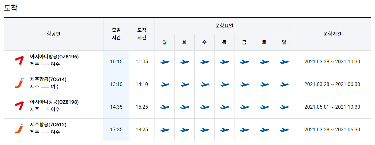 다음으로 여수 ~ 제주간 항공기 스케줄표 입니다.