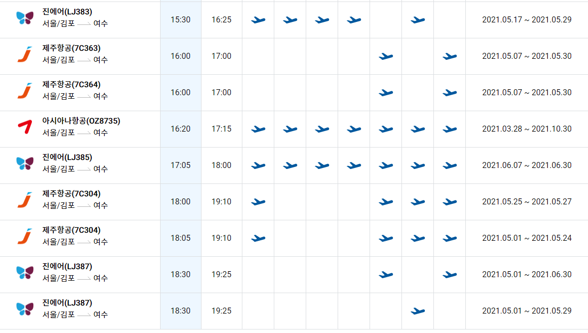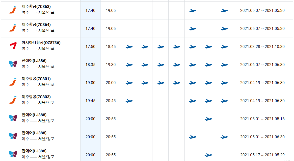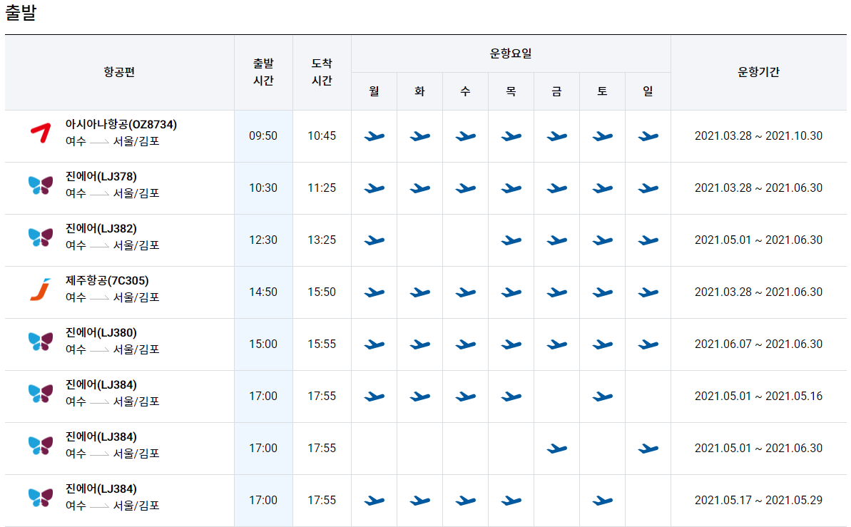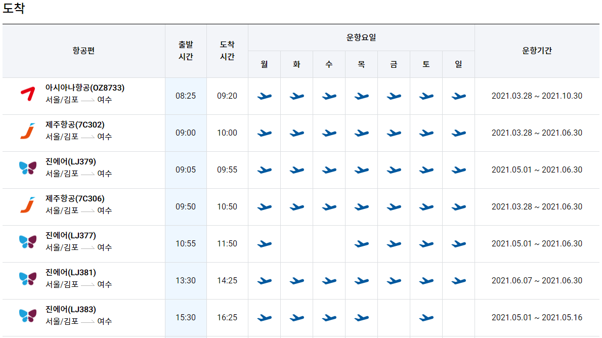 다음으로 김포공항에서 출발하여 여수공항에 도착하는 비행기 스케줄표 입니다.